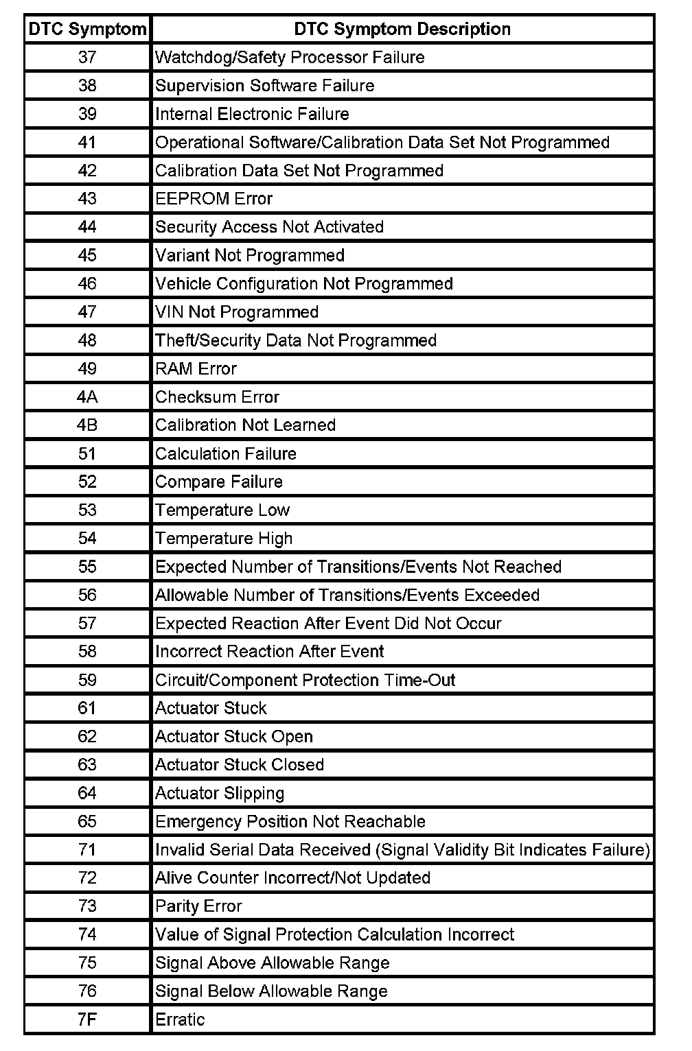 A DTC symptom is a 2-digit number which adds additional detail to a DTC. The DTC symptom provides additional information without requiring a large increase in the number of new DTCs.