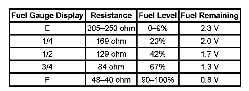 The information in this table is intended for use with the J 33431-C Signal Generator and Instrument Panel Tester. The fuel level sensor values represent the test values to be used on the Signal Generator to drive the fuel gage display to the indicated positions. Vehicles that require more than one fuel level sensor calculate gage position from many possible resistance combinations of fuel levels between the two tanks. Therefore, the values in the table may not correlate directly to readings taken from the vehicle primary or secondary sending units.