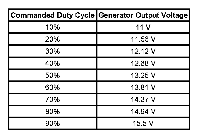 The engine control module (ECM) controls the generator through the generator field control circuit. It monitors the generator performance though the generator field duty cycle signal circuit. The ECM controls the generator through the generator field control circuit. The signal is a 5-volt pulse width modulation (PWM) signal of 128 Hz with a duty cycle of 0-100 percent. Normal duty cycle is between 5-95 percent. Between 0-5 percent and 95-100 percent are for diagnostic purposes. The table shows the commanded duty cycle and output voltage of the generator: