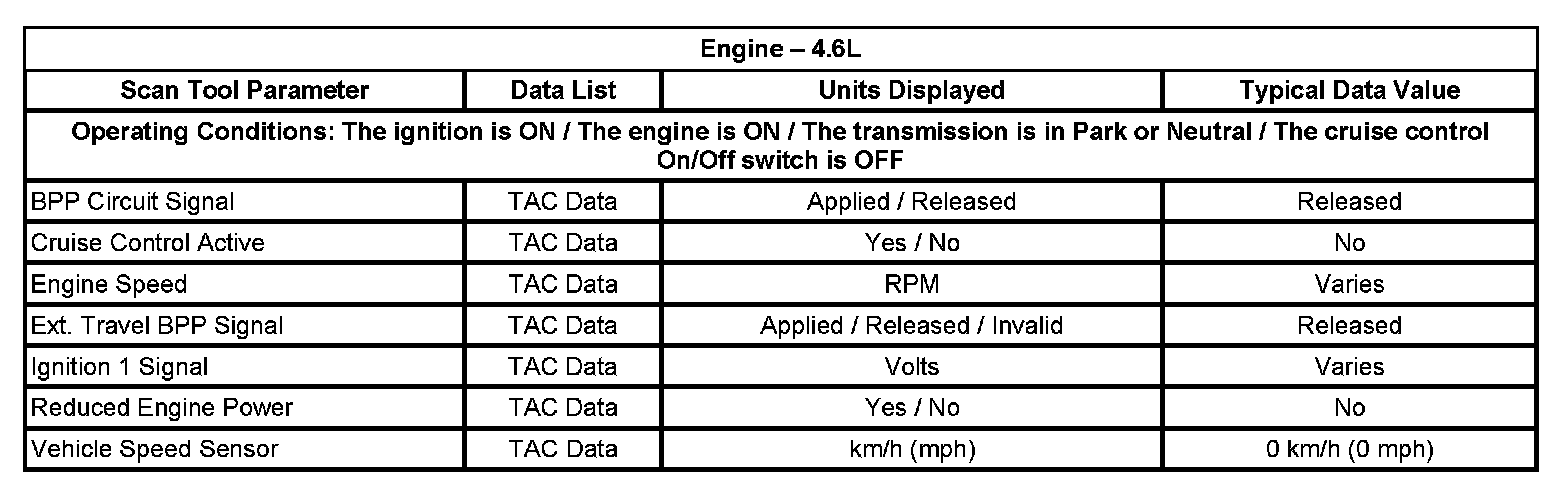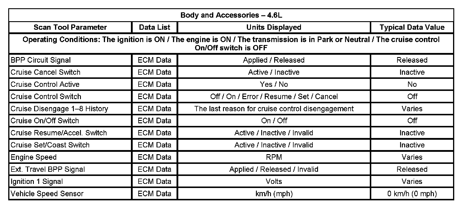 The scan tool data lists contain all of the cruise control related parameters that are available on the scan tool. The parameters in the list are arranged in alphabetical order. The data list column indicates the location of the parameter within the scan tool menu selections.