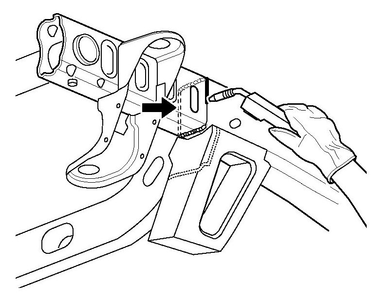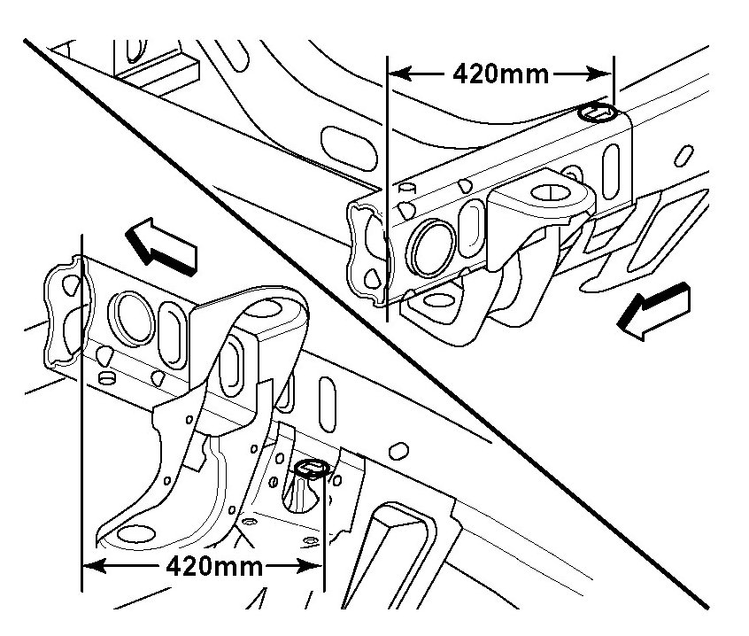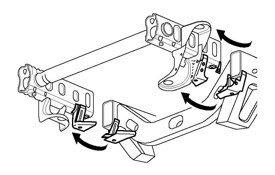 If damage permits, locate and cut off the front portion of the frame assembly (first 420 mm (16 - 1/2 in.) along the die mark indicators and through the sway bar mounting brackets. Front frame service section installation requires replacement of the sway-bar mounting brackets. The front and rear body mounts, radiator support mounts, sway-bar brackets, steering gear and transmission cross-member can be ordered and replaced separately.