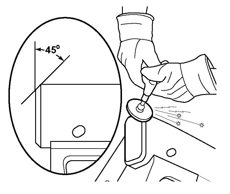 1. Grind to taper existing frame rail seam at 45 degrees angle.