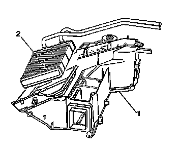 1. Install the heater core (2) to the HVAC module assembly (1).