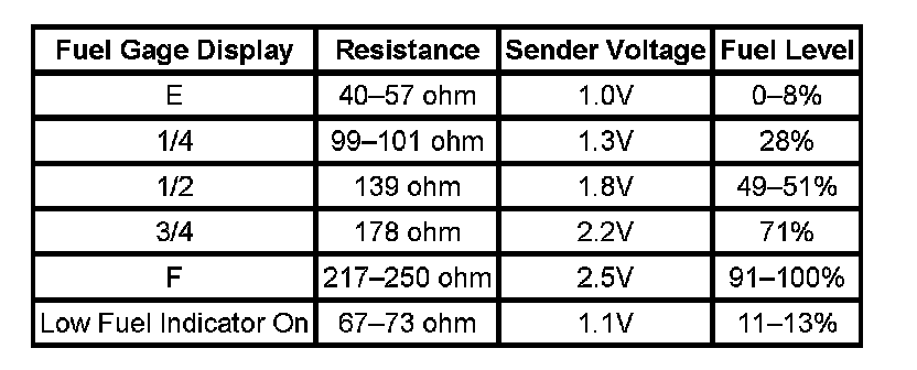 The information in this table is intended for use with the J 33431-C Signal Generator and Instrument Panel Tester. The fuel level sensor values represent the test values to be used on the Signal Generator to drive the fuel gage display to the indicated positions. Vehicles that require more than one fuel level sensor calculate gage position from many possible resistance combinations of fuel levels between the two tanks. Therefore, the values in the table may not correlate directly to readings taken from the vehicle primary or secondary sending units.
