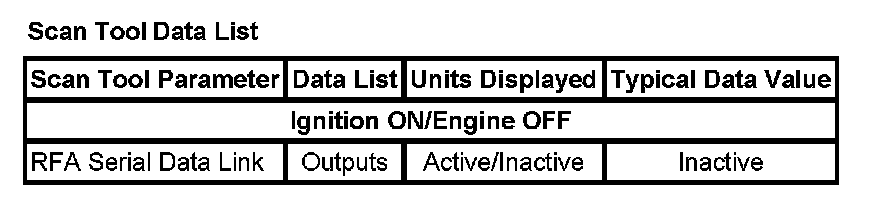 The Keyless Entry Scan Tool Data List contains all of the keyless entry related parameters that are available on the scan tool. The parameters in the list are arranged in alphabetical order. The column, "Data List," indicates the location of the parameter within the scan tool menu selections. Use the Keyless Entry Scan Tool Data List as directed by a diagnostic table or in order to supplement the diagnostic procedures. Begin all of the diagnostic procedures with Diagnostic System Check - Vehicle. Initial Inspection and Diagnostic Overview