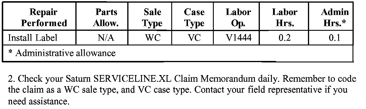 Since the service procedure in this bulletin (install a label) can be performed quickly and easily and to reduce the inconvenience to the customer labels will be mailed to customers of record. If however a customer brings their vehicle in to your dealership for this recall if at all possible have the label installed on the vehicle immediately so that the customer does not have to leave their vehicle at the dealership.