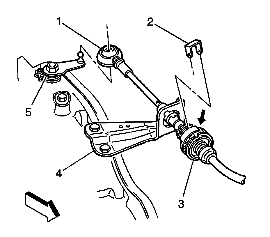 3. Use a large flat-bladed tool in order to remove the automatic transaxle range selector cable (1) from the cable lever (5).