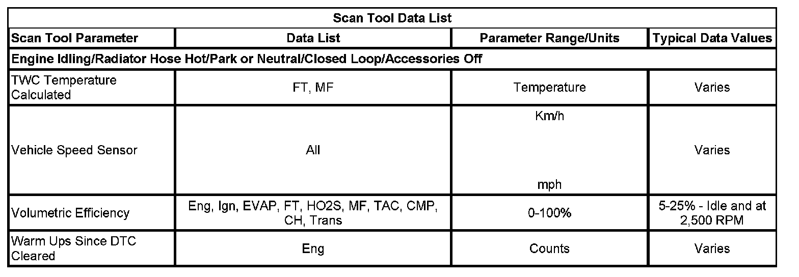 The Engine Scan Tool Data List contains all engine related parameters that are available on the scan tool. The list is arranged in alphabetical order. A parameter may appear in any one of the data lists, and in some cases may appear more than once, or in more than one data list in order to group certain related parameters together.