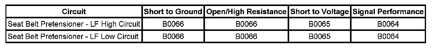 * Seat belt pretensioner - LF high circuit is less than 2.4 volts and the seat belt pretensioner - LF deployment loop is more than 6 ohms for 500 milliseconds.