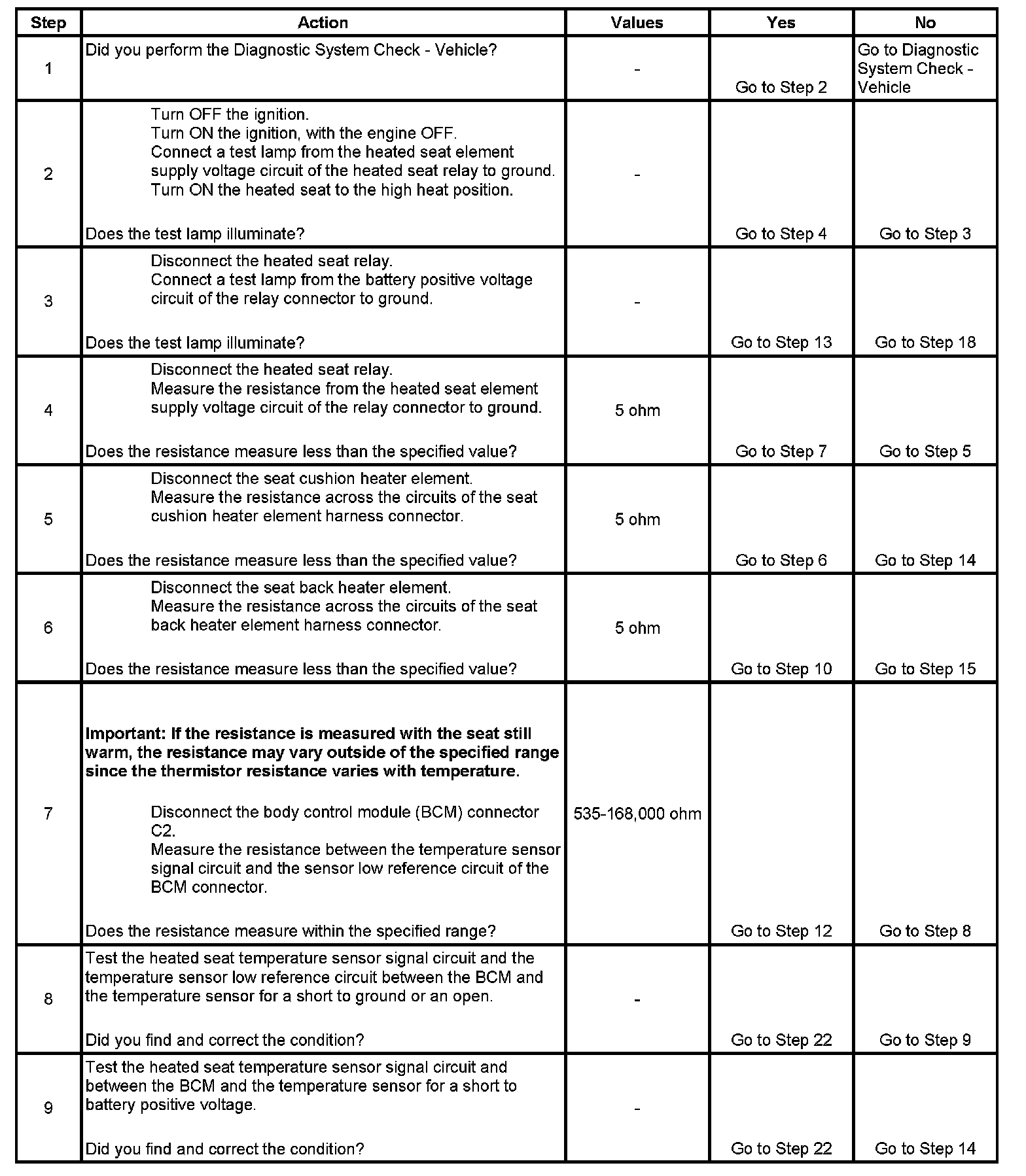 The BCM also monitors the sensor signal circuit for a change in voltage that is either to fast or to slow. The slow rate check is performed only when the heated seat is initially turned on with a cold seat in order to prevent setting a false DTC.