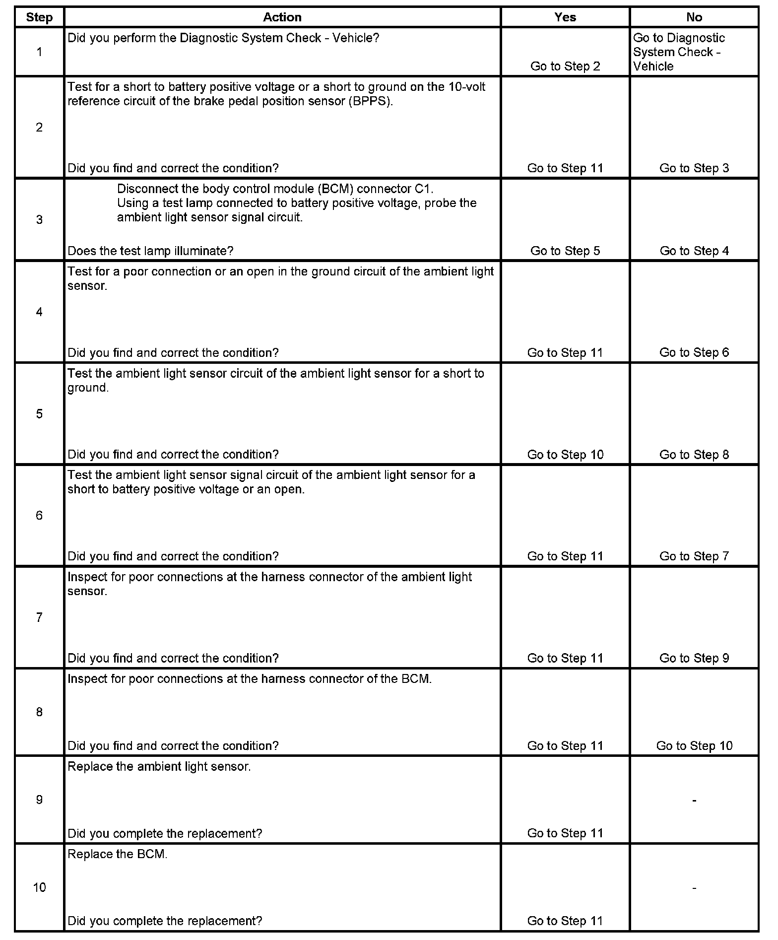 The body control module (BCM) monitors the ambient light sensor signal circuit in order to determine if the daytime running lights (DRL) or the auto headlights (ALC) should be turned ON in the AUTO mode. When the BCM senses the ambient light sensor voltage is between 1.75-4.9 volts, either the DRL will be commanded ON or the ALC will be commanded ON.