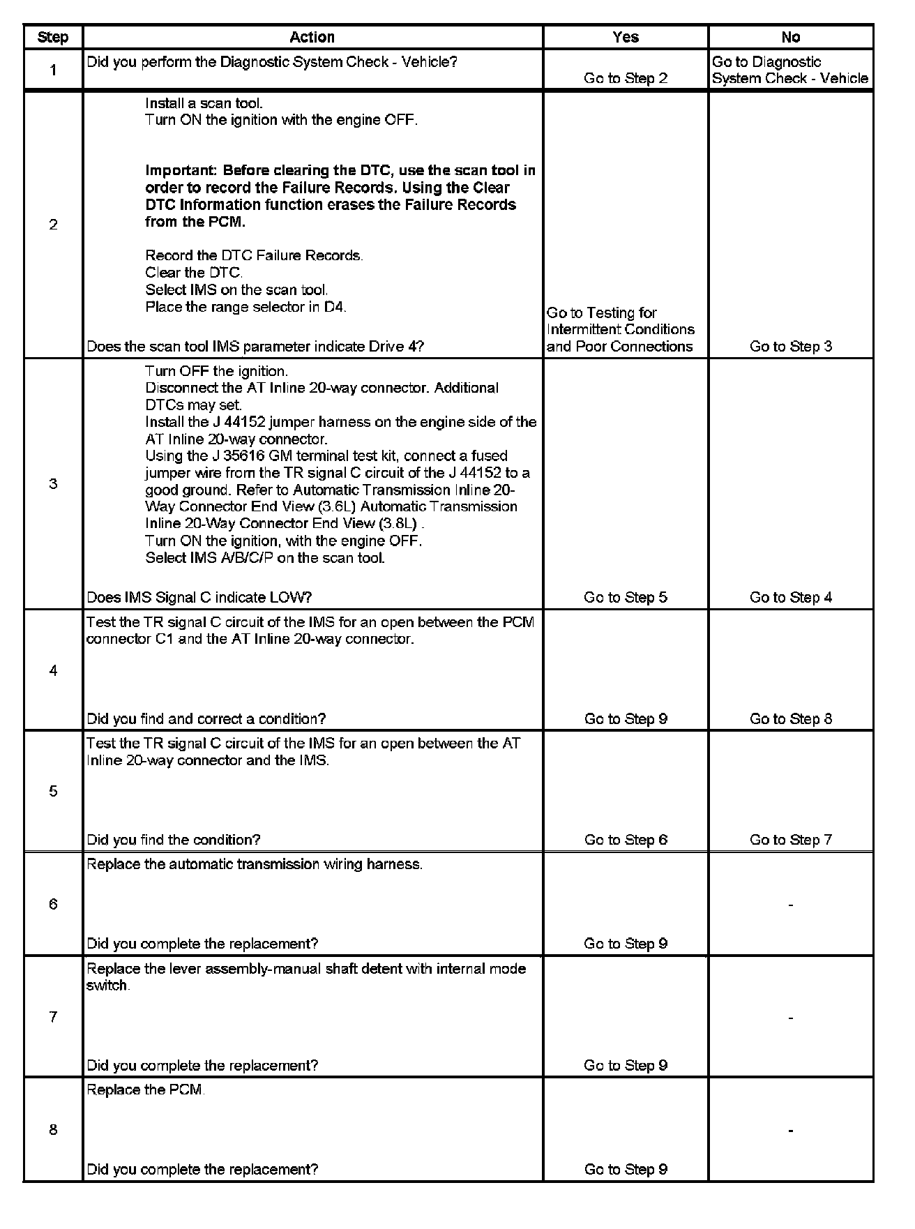 3. This step tests the integrity of the engine harness and PCM by checking for the Signal C state change from HI to LOW. A LOW signal indicates the fault is either in the internal transmission harness or the switch. A HI signal indicates the fault is either in the engine harness or the PCM.