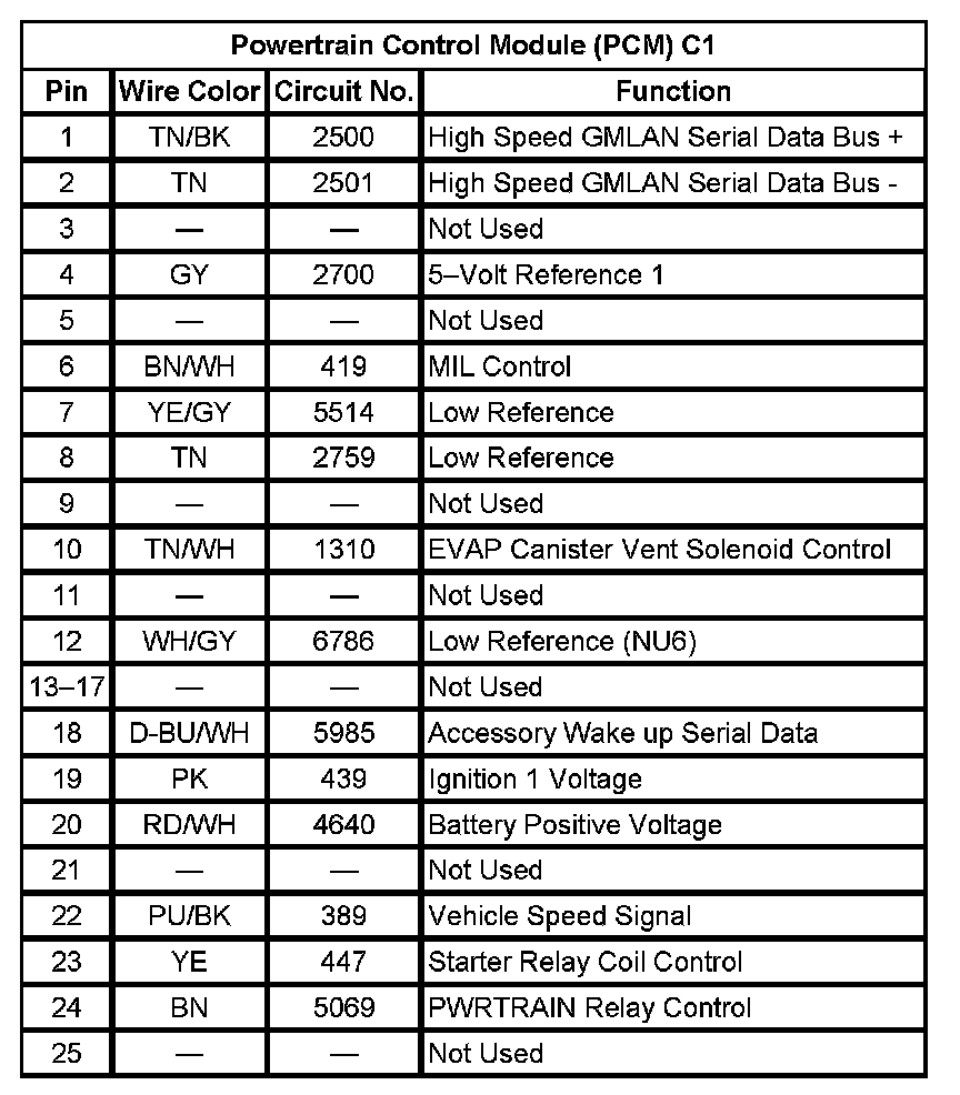 Powertrain Control Module (PCM) C1 (Pin 1 To 25):