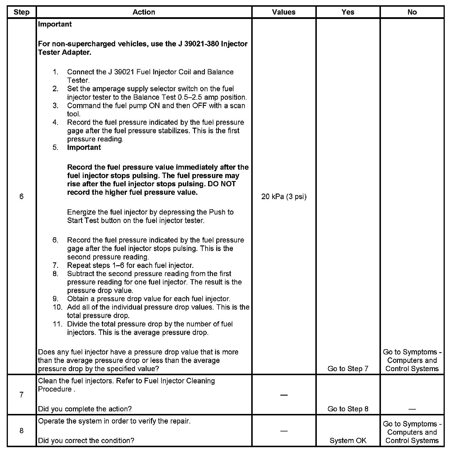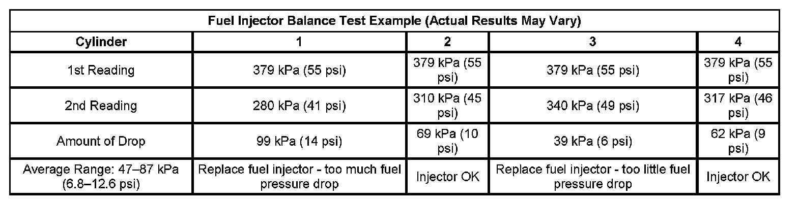 6. If the pressure drop value for each fuel injector is within 20 kPa (3 psi) of the average pressure drop value, the fuel injectors are flowing properly.