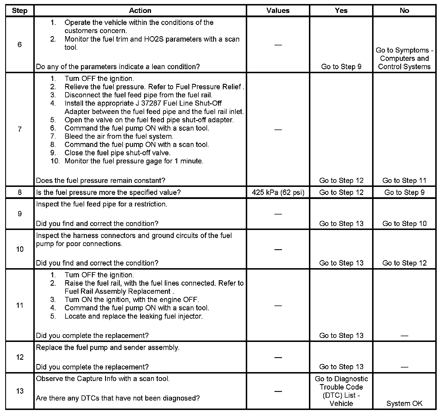10. This step verifies that a circuit condition is not the cause of a fuel pressure concern. Inspect all fuel pump electrical circuits thoroughly.