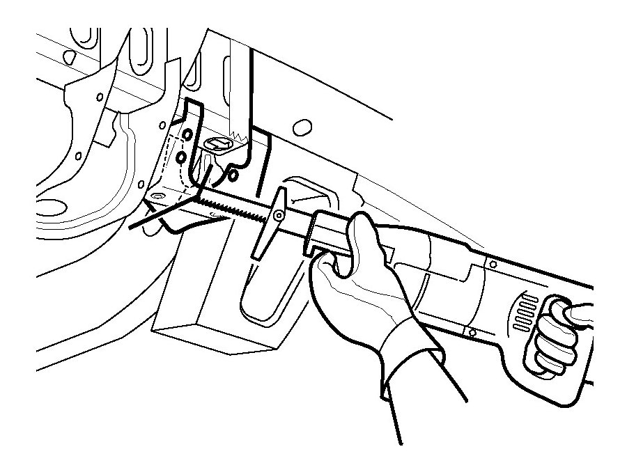 4. Cut each frame rail at the rear edge of the tape line and through the sway bar bracket using a reciprocating saw or equivalent tool, as shown.