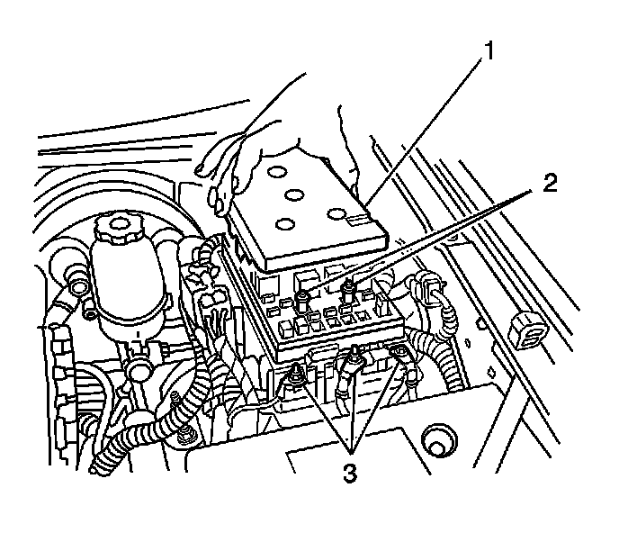 5. Remove the fuse relay center bolts (3) and remove the fuse relay center from the junction block bracket.