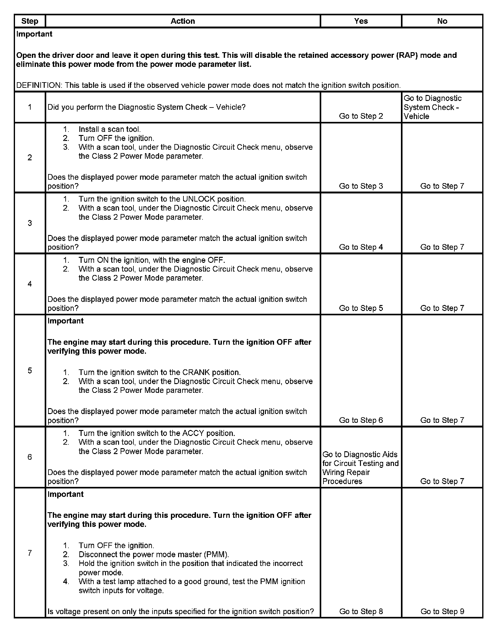 The numbers below refer to the step numbers on the diagnostic table.