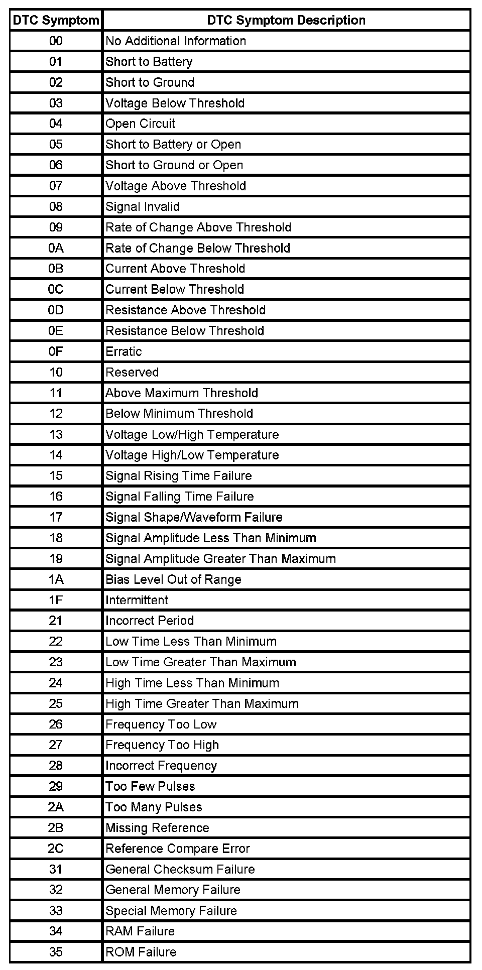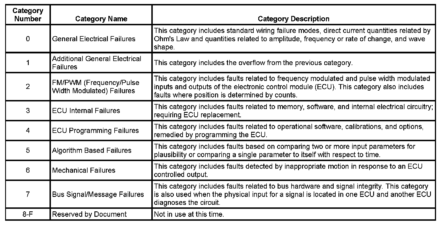 The DTC symptom is made up of 2 alphanumeric digits. The first digit following the DTC indicates the DTC symptom category. There are 16 possible categories available in the range of 0 through the letter F. Currently there are 8 categories in use, 0 through 7. These 8 categories together with their definitions are given below.