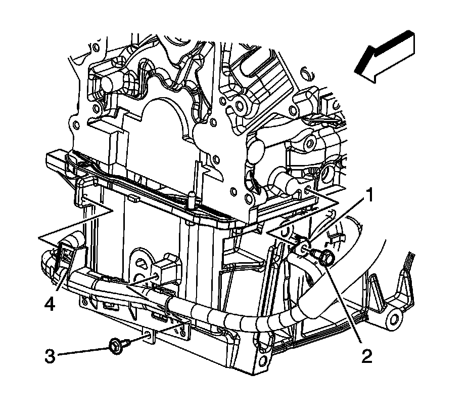 9. Remove the negative battery cable terminal bolt (2) from the engine block.