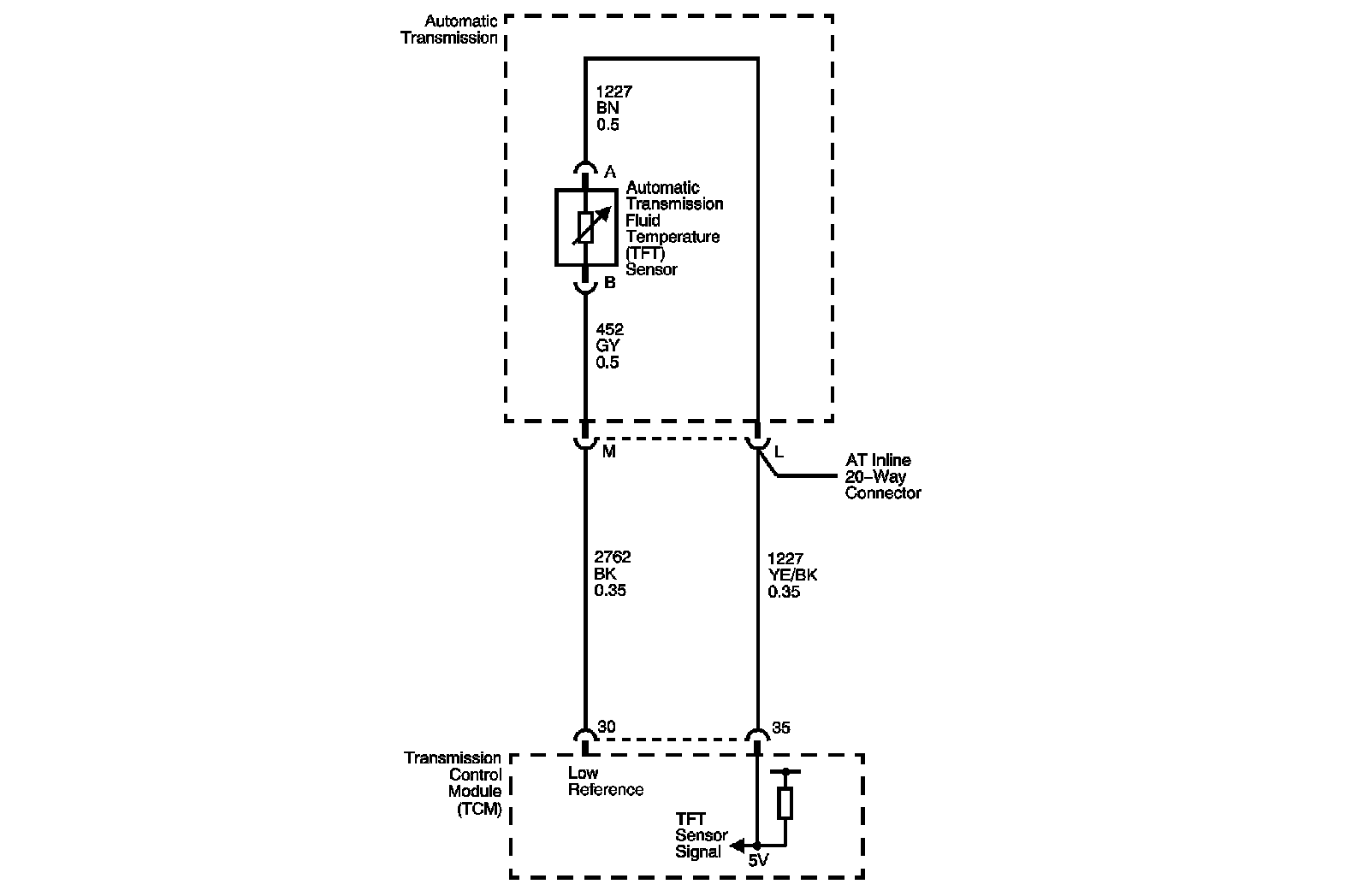 The automatic transmission fluid temperature (TFT) sensor is a negative coefficient thermistor whose resistance value changes based on temperature. The transmission control module (TCM) provides a 5-volt reference to the sensor circuit. A high TFT or a short to ground on the signal circuit results in low signal voltage. The TFT sensor operating range is -40 to +151°C (-40 to +304°F).