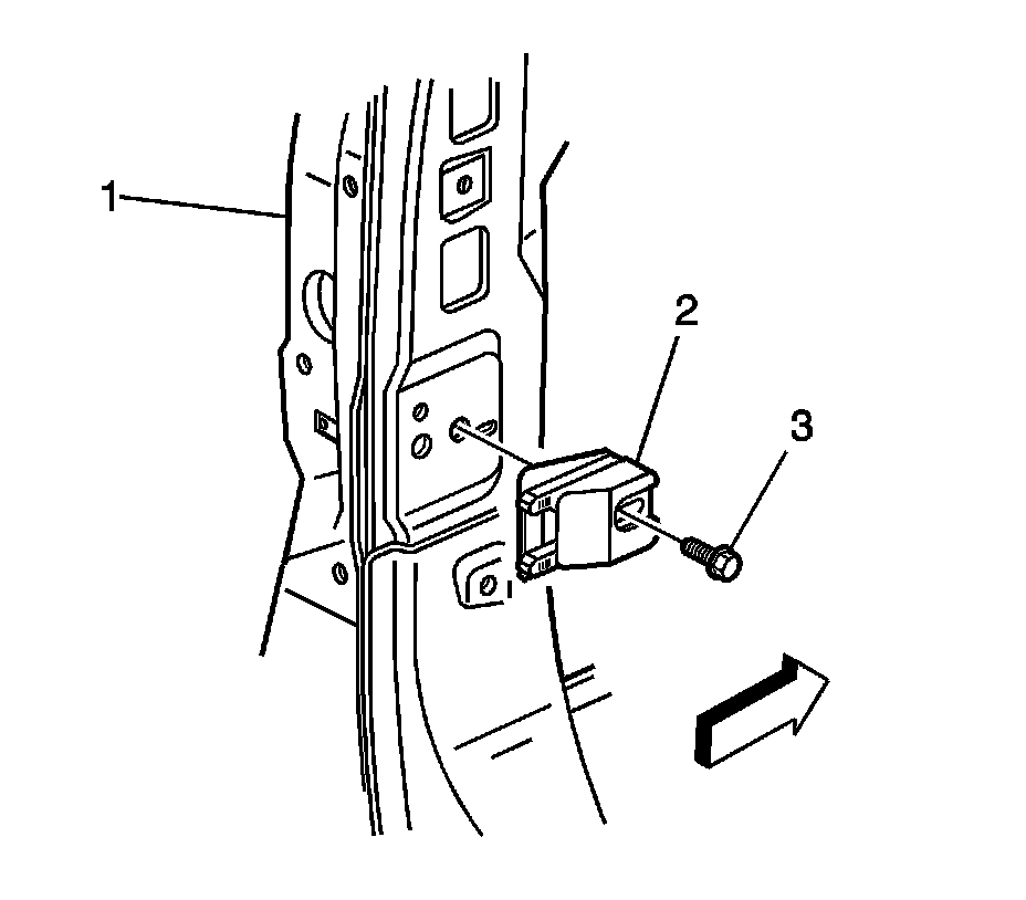 1. Position the wedge (2) to the body side inner panel and index the locking tab to the body panel.