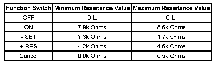 Important: The cruise control switch must be ON in order to properly measure the resistance of the - SET, the + RES, and the Cancel switches.