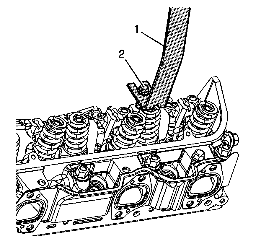 4. Using caution so as not to damage the valve spring or valve spring dampener, compress the valve spring using the J 5892-D (1) and the EN-47823 (2).