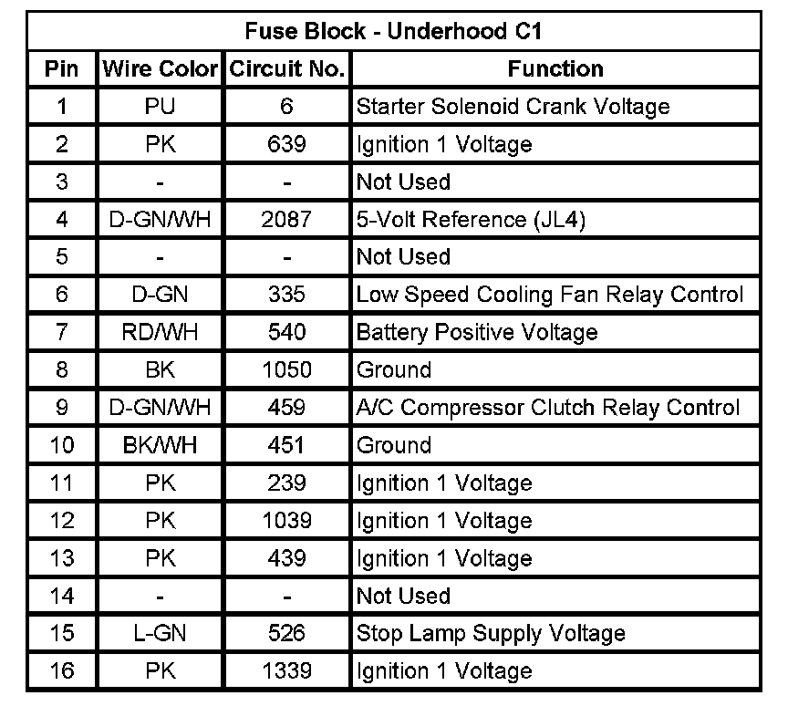 Fuse Block - Underhood C1 (Pin 1 To 16):