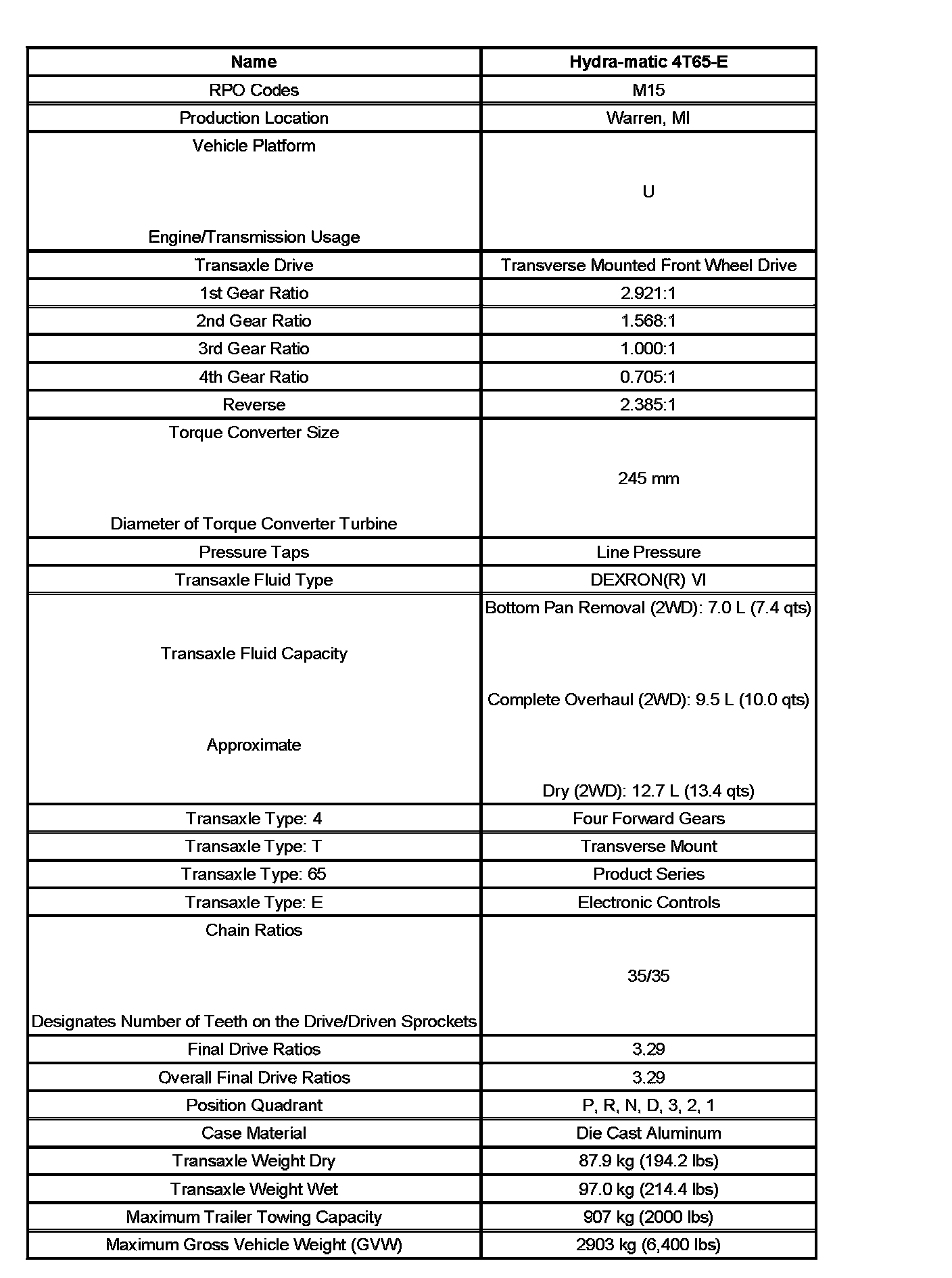 Transmission General Specifications: