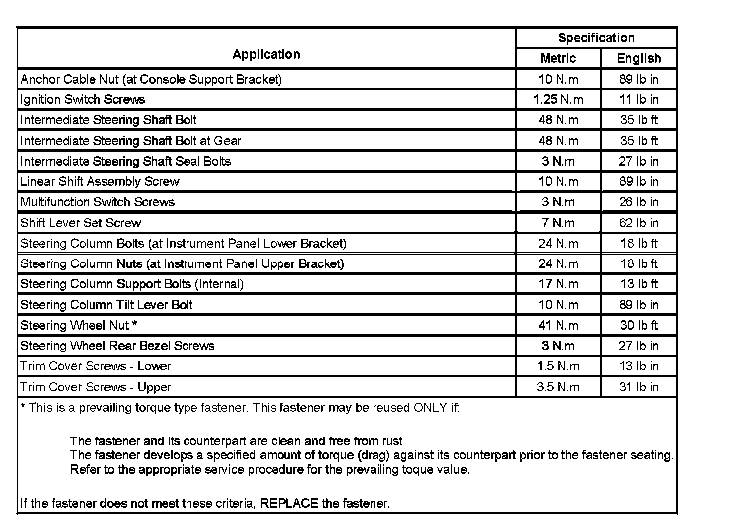 Fastener Tightening Specifications:
