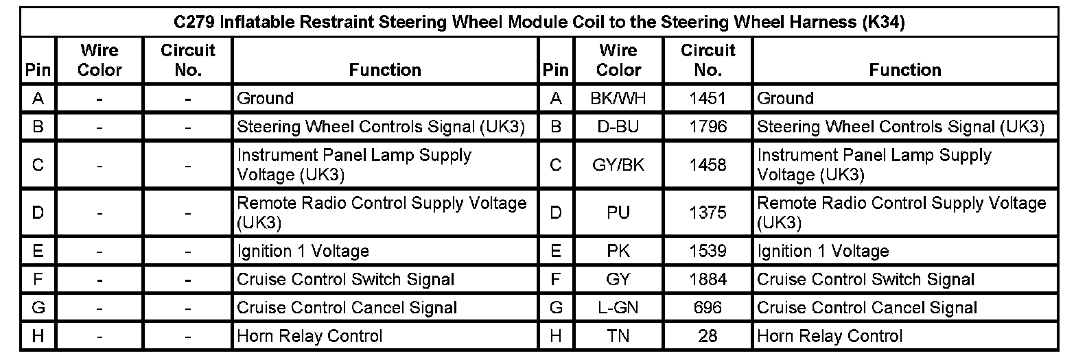 C279 Inflatable Restraint Steering Wheel Module Coil to the Steering Wheel Harness (K34)