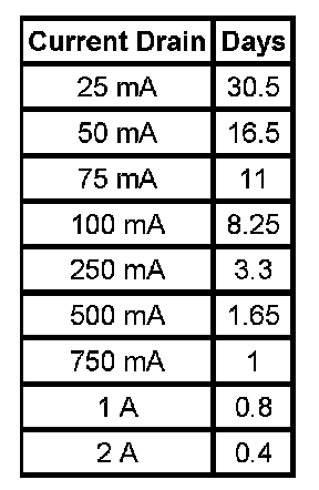 * The battery run down time will vary depending on cold cranking amperage (CCA) and reserve capacity (RC). If the CCA and RC are higher, then the battery run down time would be longer. If the CCA and RC are lower, then the battery run down time would be shorter. The graph below indicates roughly how many days a 690 CCA battery with at 110 min. RC (60.5 AH) starting at 80 percent state of charge will last with a constant current draw until it reaches 50 percent state of charge. Differences in battery rating and temperature will affect the results.