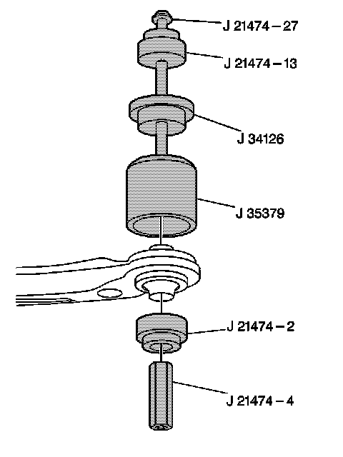 5. Tighten the J 21474-4 until the bushing is removed from the control arm.