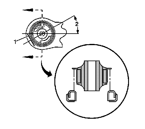 1. Align the flat edge of the bushing flange to the mark in the control arm (1). Ensure that the flat edge of the bushing flange is 30 degrees (2) from the centerline of the lower control arm. Ensure that the thin slot in the bushing is facing outboard.