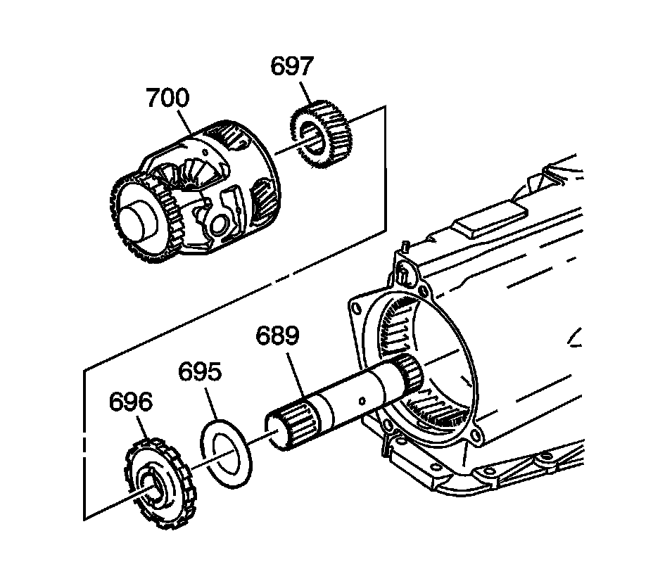 1. Assemble the sun gear thrust bearing (698), the differential carrier sun gear (697), the park gear (696), the internal gear thrust bearing (695) and the sun gear shaft (689) into the differential carrier (700).