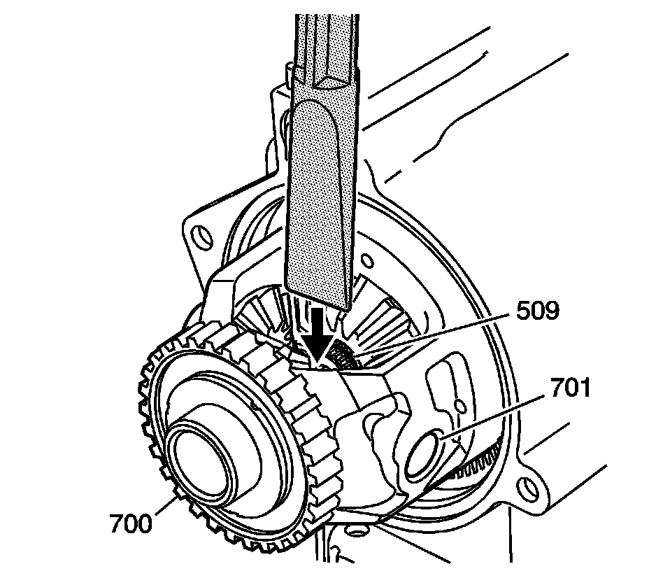3. Rotate the differential carrier until the end of the output shaft can be seen and the differential pinion shaft (701) is in a horizontal position.