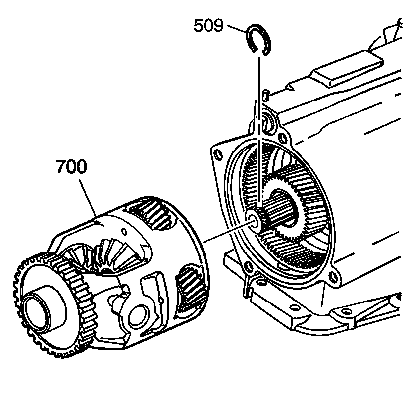 1. Install the drive axle retaining ring (509) and the output shaft differential inboard snap ring (512) onto the output shaft (510).