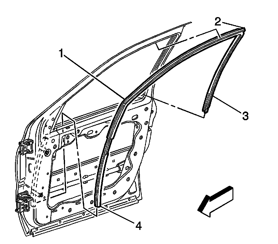 1. Position the front weatherstrip edge (4) to the door frame channel.