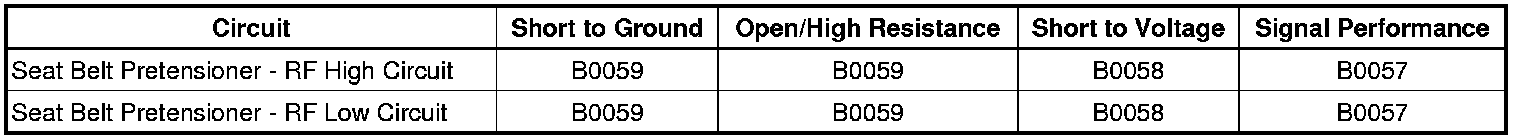 * Seat belt pretensioner - RF high circuit is less than 2.4 volts and the seat belt pretensioner - RF deployment loop is more than 6 ohms for 500 milliseconds.