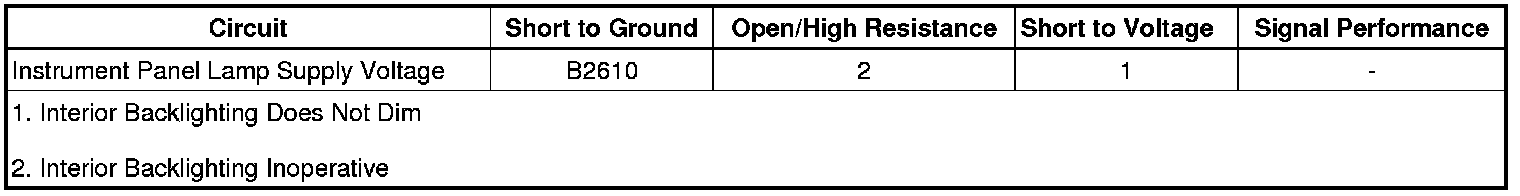 The BCM supplies a voltage reference through the I/P dimming voltage reference circuit to the interior lamp dimmer switch. When the dimmer switch is placed in a desired brightness position, reference voltage is applied through the dimmer switch rheostat and the I/P dimming signal circuit to the BCM. The BCM interprets this voltage signal, then applies a variable voltage through the instrument panel lamp supply voltage circuit, illuminating the components listed below: