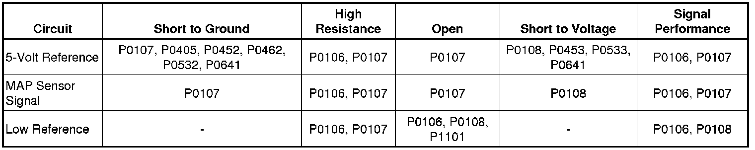 The manifold absolute pressure (MAP) sensor has a 5-volt reference circuit, a low reference circuit, and a signal circuit. The powertrain control module (PCM) supplies 5 volts to the MAP sensor on a 5-volt reference circuit and provides a ground on a low reference circuit. The MAP sensor provides a voltage signal to the PCM on a signal circuit relative to the intake manifold pressure changes.