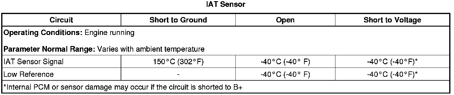 The intake air temperature (IAT) sensor is a variable resistor. The IAT sensor has a signal circuit and a low reference circuit. The IAT sensor measures the temperature of the air entering the engine. The powertrain control module (PCM) supplies 5 volts to the IAT signal circuit, and a ground for the IAT low reference circuit.