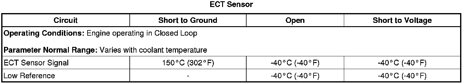 If over -38°C (-36°F), test the signal circuit of the ECT sensor for a short to ground, or a short to any low reference circuit. If the ECT circuit test OK, then replace the ECT sensor.