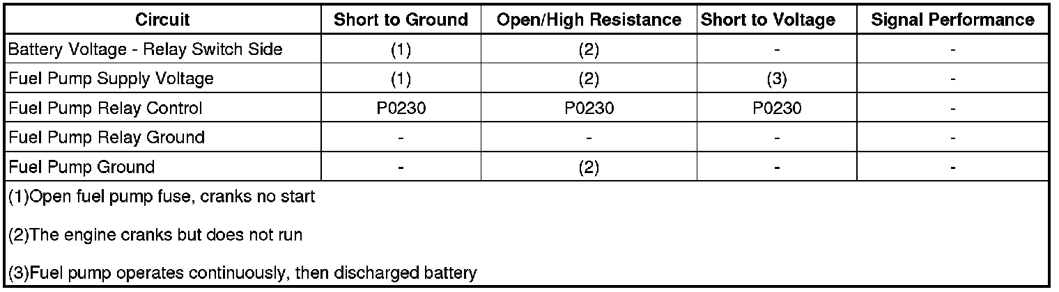 The PCM monitors the voltage on the fuel pump relay control circuit. If the PCM detects an incorrect voltage on the fuel pump relay control circuit, a fuel pump relay control DTC sets.