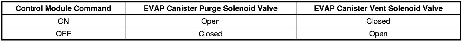 This DTC tests for undesired intake manifold vacuum flow to the evaporative emission (EVAP) system. The powertrain control module (PCM) seals the EVAP system by commanding the EVAP canister purge solenoid valve OFF and the EVAP canister vent solenoid valve ON. The PCM monitors the fuel tank pressure (FTP) sensor to determine if a vacuum is being drawn on the EVAP system. If vacuum in the EVAP system is more than a predetermined value within a predetermined time, this DTC sets. The following table illustrates the relationship between the ON and OFF states, and the Open or Closed states of the EVAP canister purge and vent solenoid valves.