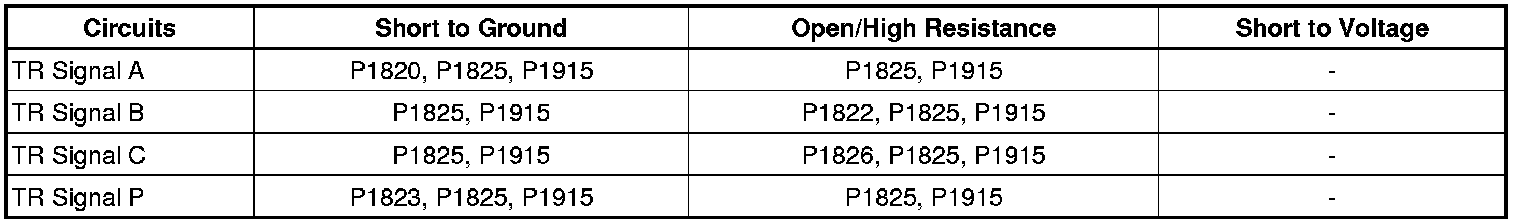If any of the TR signal circuits display less than 10 ohms, test the affected TR signal for a short to ground.