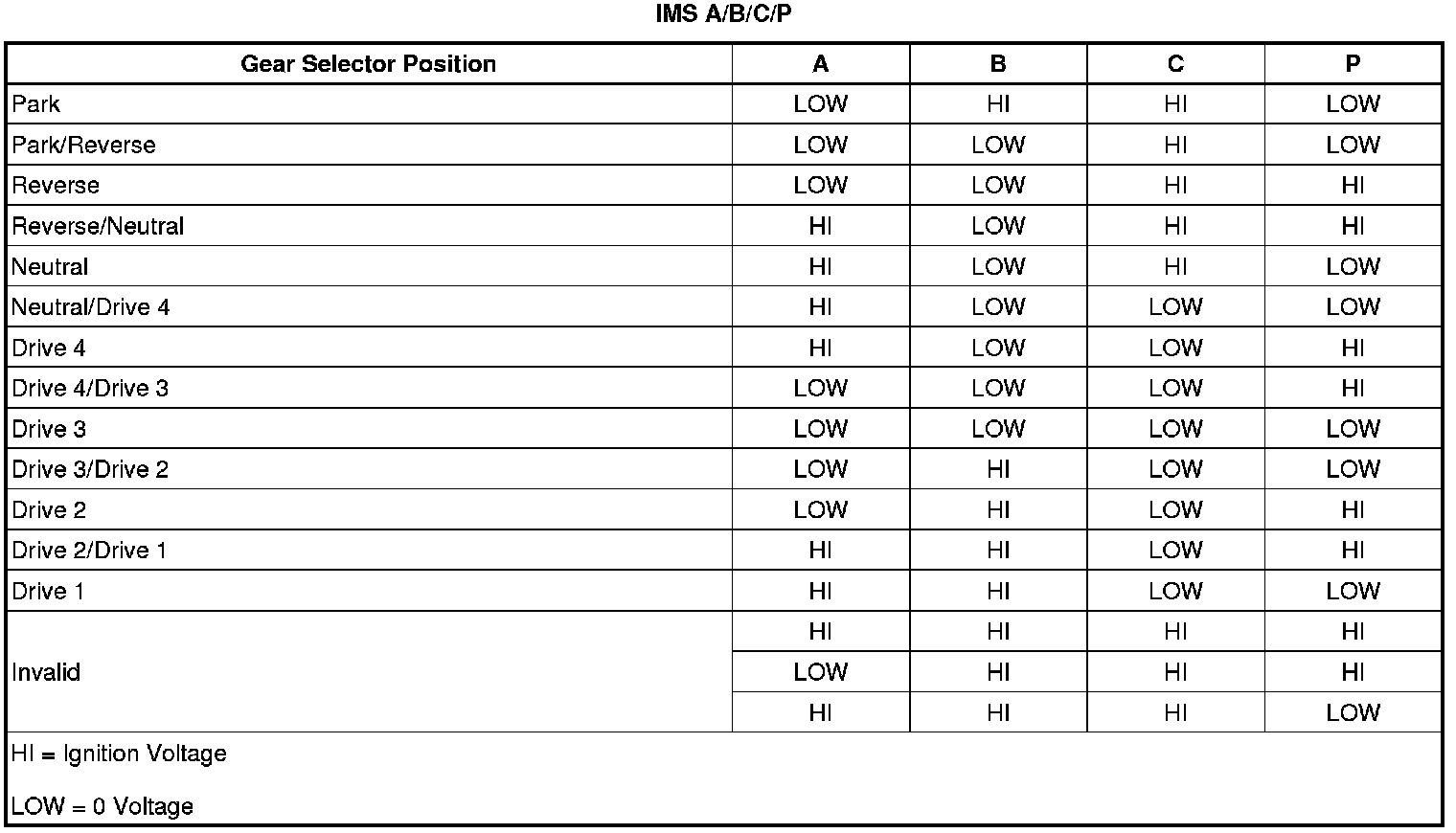 The internal module switch (IMS) is a sliding contact switch attached to the selector detent inside the transmission side cover. The 4 inputs to the transmission control module (TCM) indicate the transmission range selector position. The input voltage level at the TCM is high, B+, when the IMS is open and low when the switch is closed to ground. The 4 input parameters represented are Signals A, B, C and P - Parity. Refer to Transmission Internal Mode Switch Logic (Transmission Internal Mode Switch Logic).