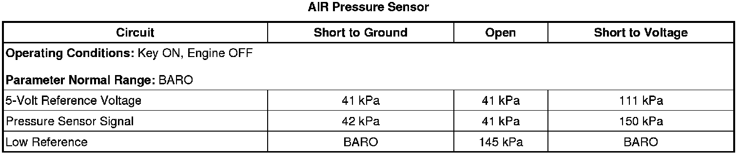 * The PCM determines that the difference between the AIR pressure sensor and the barometric pressure (BARO) sensor signals is greater than 10 kPa when the AIR pump is commanded OFF.