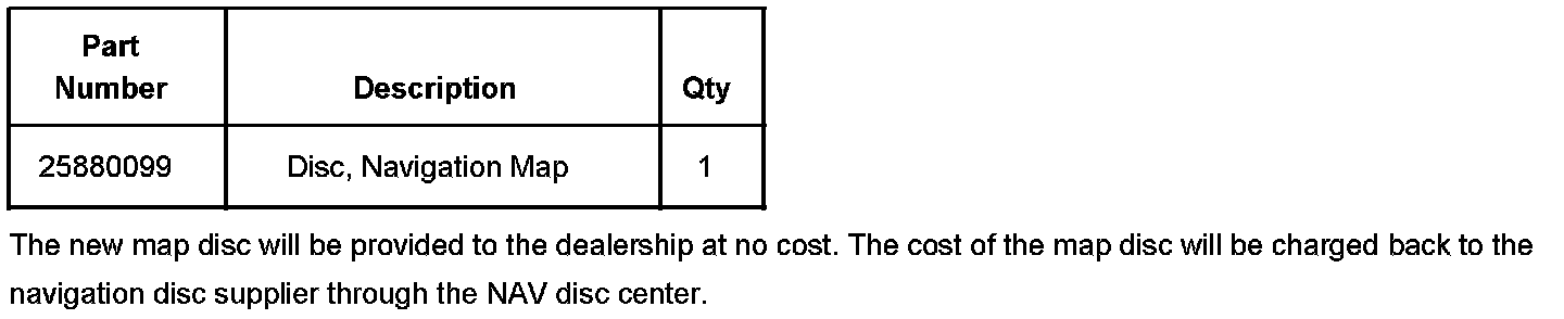 If the vehicle is a 2008 model and has a 2007 model year map disc, contact the Navigation (NAV) Disc Center and request a new 2008 model year map disc, P/N 25880099.
